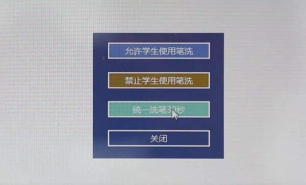 在華文眾合智慧書法教室系統(tǒng)界面,鼠標(biāo)上移至屏幕頂端任意位置,會出現(xiàn)一排快捷菜單,點(diǎn)擊筆洗,會彈出筆洗功能菜單,點(diǎn)擊【統(tǒng)一洗筆30秒】,學(xué)生端的筆洗器就會出水30秒。這時(shí)候可以讓學(xué)生進(jìn)行洗筆或潤筆的操作。出水30秒后會自動停水。