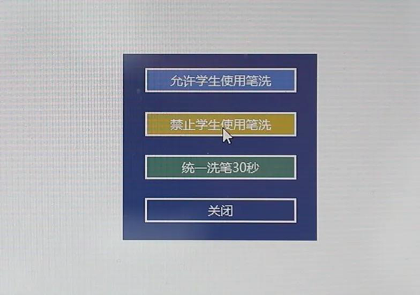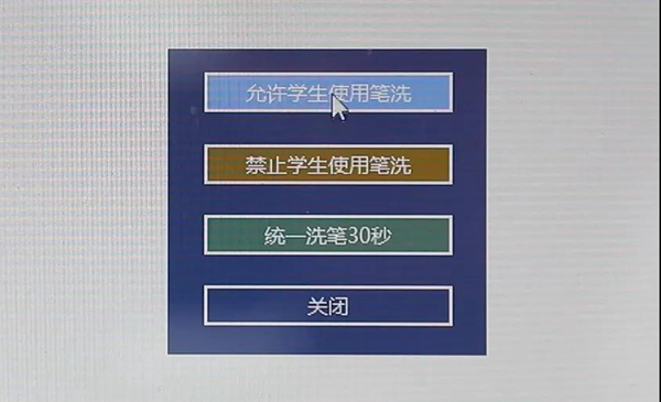 在筆洗功能菜單中點(diǎn)擊【禁止學(xué)生使用筆洗】,學(xué)生端的筆洗控制按鈕會自動消失,這樣就收回學(xué)生洗筆權(quán)限。課堂盡在老師掌握。