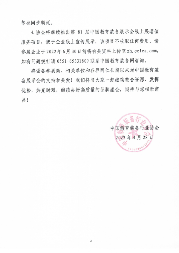 為配合國家統籌推進疫情防控和經濟社會發展,有序恢復行業市場經營活動,我協會于2022年3月28日發布《關于第81屆中國教育裝備展示會延期召開的通知》。鑒于當前全國疫情多點、面廣、頻發,經多方溝通和認真研判,為保障參展參會人員健康安全,保證展會效果,節約參展成本,決定2022年上半年展示會與下半年展示會合并召開,舉辦地點不變,召開時間視疫情防控情況另行通知。具體事項如下: