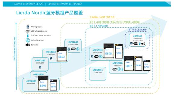 利爾達的Nordic Bluetooth LE模組家族涵蓋了從nRF52805到nRF5340低、中、高端各類不同型號的Bluetooth LE SoC,客戶可根據需求自行選擇。