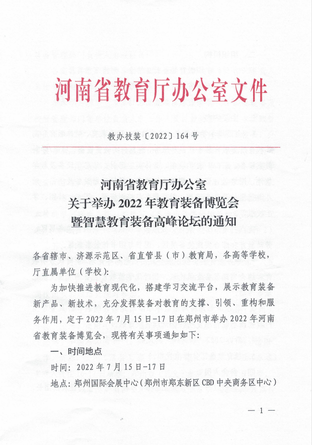 河南省教育廳辦公室關(guān)于舉辦2022年教育裝備博覽會(huì)暨智慧教育裝備高峰論壇的通知