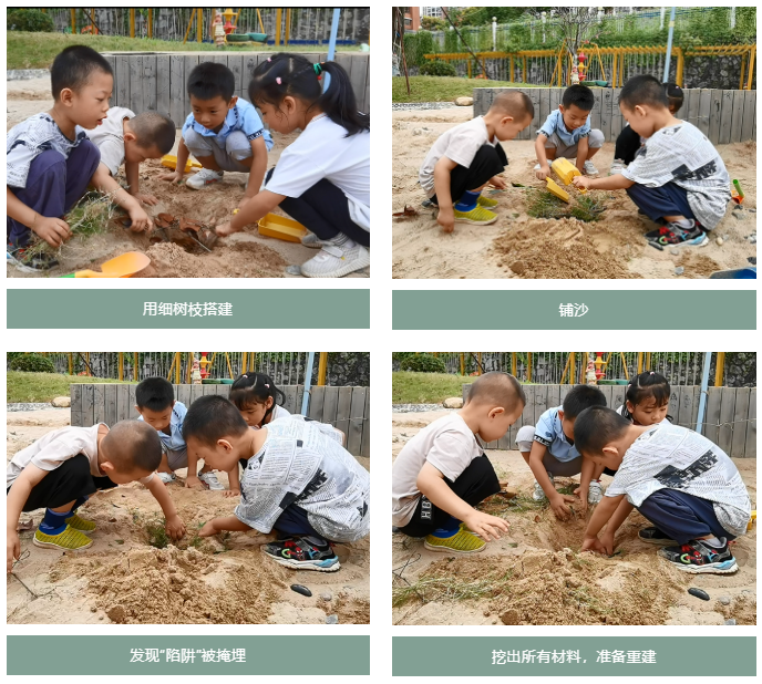 看到小伙伴們還在繼續鋪樹葉,文文放下了手中的鏟子,等待著。這時,琦琦又找來了一些細草鋪在“陷阱”里面,鋪好后志鵬和文文開始拿著沙鏟往草上鋪沙,鋪著鋪著琦琦發現用草做的陷阱蓋開始往下塌陷,便說道:“別往里面蓋沙了。”文文說:“那我們重新蓋吧!”說完便把塌陷在陷阱里面的東西都挖了出來,很快他們就又想出來新的辦法——把細樹枝換成粗一點的東西。朵朵跑到旁邊的木工區找來了一些小木棍,搭建再次開始。