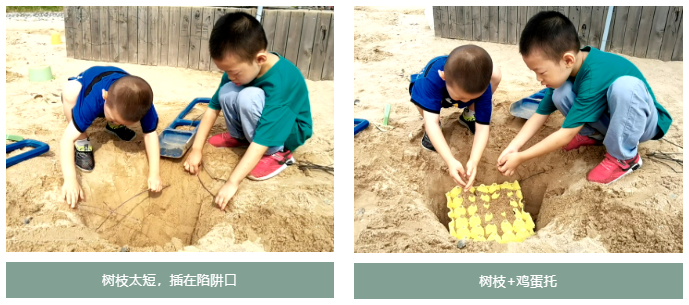 孩子們通過前期的討論和實踐,已經對陷阱有了進一步的了解:陷阱應該比腳大一些,不然掉不下去;挖好陷阱后可以蓋上一些沙進行隱藏。