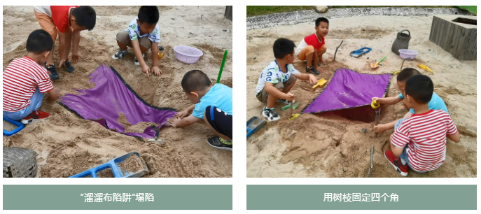 經過前兩次的游戲,幼兒積累了豐富的經驗,游戲水平不斷提升,解決問題的能力逐步增強,能通過改變游戲材料使游戲得以持續進行。隱藏在沙池里的陷阱成功讓小伙伴掉入,這給孩子們后期對陷阱游戲的進一步探索增添了信心。