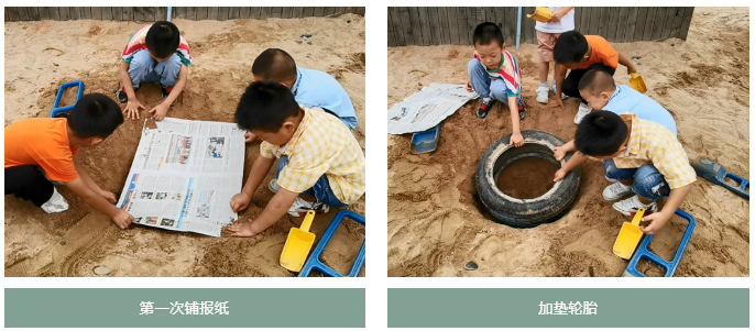 幾分鐘后,志鵬、琦琦、哲哲推來了一個輪胎,幾人合力將輪胎放進了挖好的坑里,調整好輪胎位置后便開始鋪報紙,幾人將報紙扯過來、扯過去,始終有一點縫隙不能完全遮住輪胎口。在一旁的知暄說道:“我知道有什么辦法了,鋪兩張就行了。”他們采取了知暄的意見,又找來兩張報紙交錯鋪開,并整理報紙邊緣與輪胎貼合,再用沙固定報紙四周。做完這一些后,琦琦開始往報紙上層鋪沙,志鵬也跟著鏟沙鋪沙,這時琦琦說:“要用干沙,不要用濕沙,干沙輕一些。”五個人小心翼翼地將沙鋪滿了整張報紙,并細心地用手整理好還沒蓋住的報紙。