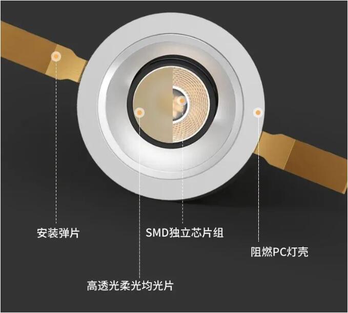 在防眩光設(shè)計上,宜美照明萬花筒射燈采用的是深藏光源與使用高透光柔光均光片雙重保障,光源深至46.3mm,能避免光源直射眼睛,從而更加柔和。