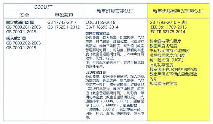 優質光是中國質量認證中心在業內提出的“教室光環境”,要求教室照明使用的燈具應通過CCC認證和CQC教室照明產品節能認證 ,圍繞“好的燈具+好的設計+好的施工+好的維護”四個角度,對教室的空間光環境參數做出了首次較為嚴格的要求。以GB7793-2010《中小學校教室采光和照明衛生標準》為主線,兼顧GB50034-2013 《建筑照明設計標準》 中的強制條款,前瞻性考慮了后來發布的GB40070-2022 《兒童青少年學習用品近視防控衛生要求》,出臺了CQC16-465199-2020 《教室優質照明光環境認證規則》,是行業與企業共同升級教室空間光環境的重要里程碑。
