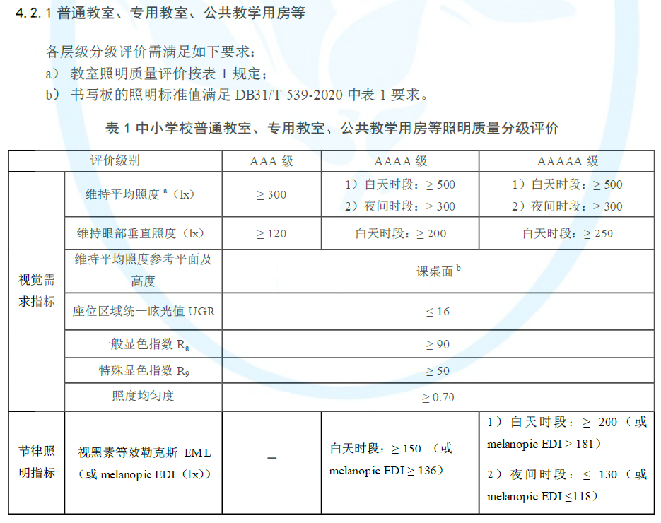節律光在國內率先開展是復旦大學與同濟大學,主要從人體的醫學指標褪黑素方面與照明指標照度進行轉換,提出了褪黑素等效勒克斯EML、褪黑素等勒效日光(D65)照度的定義,首次在上海照明電器協會的團體標準T/SIEATA 000001-2020 《中小學校教室照明質量分級評價》中體現,不僅明確了視覺需求指標、照明系統要求,還提出了節律照明指標。