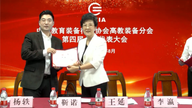 中國教育裝備行業協會會長靳諾為高教裝備分會第四屆理事長,秘書長頒發聘書。