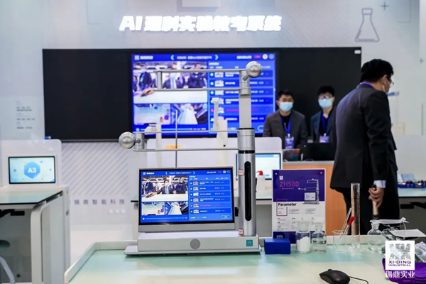 展位現場,“AI理科教室解決方案”展示區內,工作人員帶領嘉賓真實地模擬了理科實驗課堂的應用場景。讓嘉賓身臨其境地感受到了錫鼎智能教育新品及AI理科實驗教考平臺的數字化、信息化、智能化。