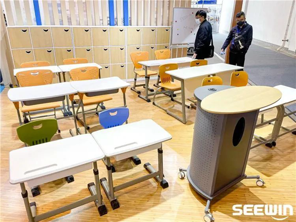 SEEWIN詩敏現(xiàn)場采用多套課桌椅共同打造標準教室空間,其中以格瑞課桌椅為主推新品,采用了大號小號搭配展出,實現(xiàn)國標高度全覆蓋,參觀者可以親身操作課桌椅,體驗環(huán)保健康的選材,用實際的產(chǎn)品向參觀者傳遞出我們選材用料的安全性。