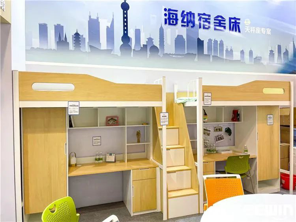 此次展會詩敏帶來了自主研發(fā)的新品,格瑞課桌椅、海納宿舍床及范雅課椅等產(chǎn)品。