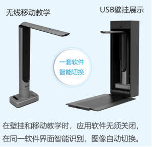 有線和無線雙模快速切換,可根據(jù)老師的教學(xué)場景,壁掛切換至移動桌面教學(xué)時,應(yīng)用軟件也無須關(guān)閉,在同一界面中實現(xiàn)智能識別,自動切換影像畫面。