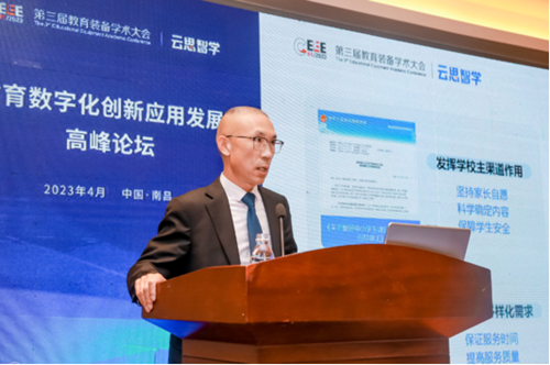 教育部關(guān)心下一代工作委員會常務(wù)副主任、中國教育裝備行業(yè)協(xié)會專家委員會主任委員王富,中國教育科學研究院黨委書記、院長,全國教育科學規(guī)劃領(lǐng)導小組辦公室主任李永智,江西省教育評估監(jiān)測研究院黨委書記劉靜儉,江西省教育技術(shù)與裝備發(fā)展中心主任熊春光,河南省教育資源保障中心主任王德如,江西省教育評估監(jiān)測研究院副院長唐旭,華東師范大學上海數(shù)字化教育裝備工程技術(shù)研究中心主任顧小清,北京云思智學科技有限公司董事長陳恭明、CEO劉渝等領(lǐng)導和嘉賓500余人出席本次大會。論壇線上點擊量超10萬人次。會議由中國教育裝備行業(yè)協(xié)會教育裝備研究院院長李興植主持。