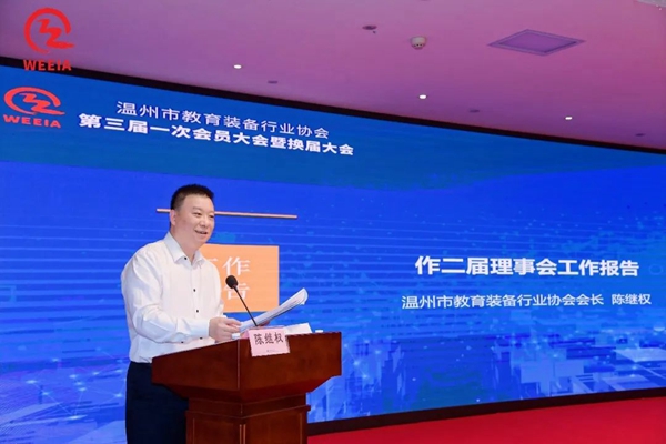 陳繼權會長在二屆理事會工作報告中,回顧了上一屆理事會的工作成果和下一屆的展望。在過去一屆中,理事會積極推進協會工作,知識產權工作、標準建設、技能人才培訓、考察交流活動、參與政策制定、開展公益慈善活動等10大工作成果顯著。協會連續獲得市級、省級、全國四好商會榮譽。希望新一屆理事會繼續以服務會員、服務社會、促進行業發展為宗旨,加強行業調研和信息共享,提升會員企業整體水平,深化產學研合作,拓展國際市場,加強組織建設等方面努力,更好地服務溫州市教育裝備行業的發展。
