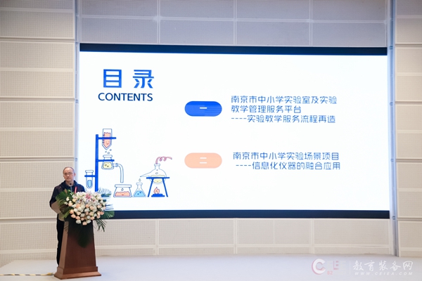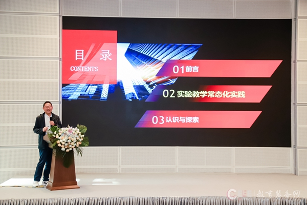 專家學術報告與經驗交流環節,中國教育裝備行業協會教育裝備研究院副院長施建國、湖州市教育技術學會會長沈建康、湖南省教育生產裝備處主任張萬敏、天津市第二南開學校副校長、高級教師尤瑞冬、南京教育技術裝備中心主任鄧中材分別作主題為“新課標背景下的實驗教學創新”、“常態化實驗教學的實踐與認識”、“聚焦’三不’問題,促進實驗教學高質量發展”、 “勤反思敬終如始 積踐步善作善成——天津市第二南開學校實驗室危化品管理使用情況報告”、“南京市中小學實驗室數字化場景重構及應用”的報告。