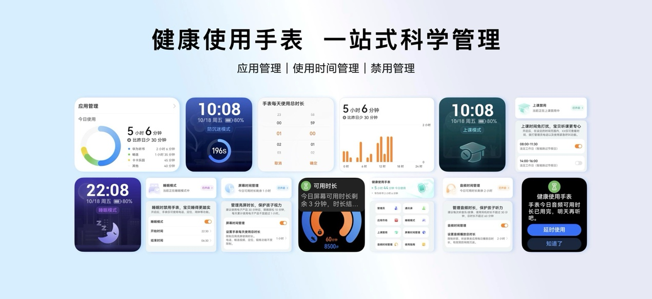 為了保障孩子擁有純凈健康的手表使用環境,華為構建端到端內容防護體系,通過融合多源AI算法,實現不良內容屏蔽。同時華為兒童手表5 Pro 新增健康使用手表功能,可實現對于手表應用、使用時間及禁用場景等多維度一站式科學管理。守護孩子安全,貼心更省心。