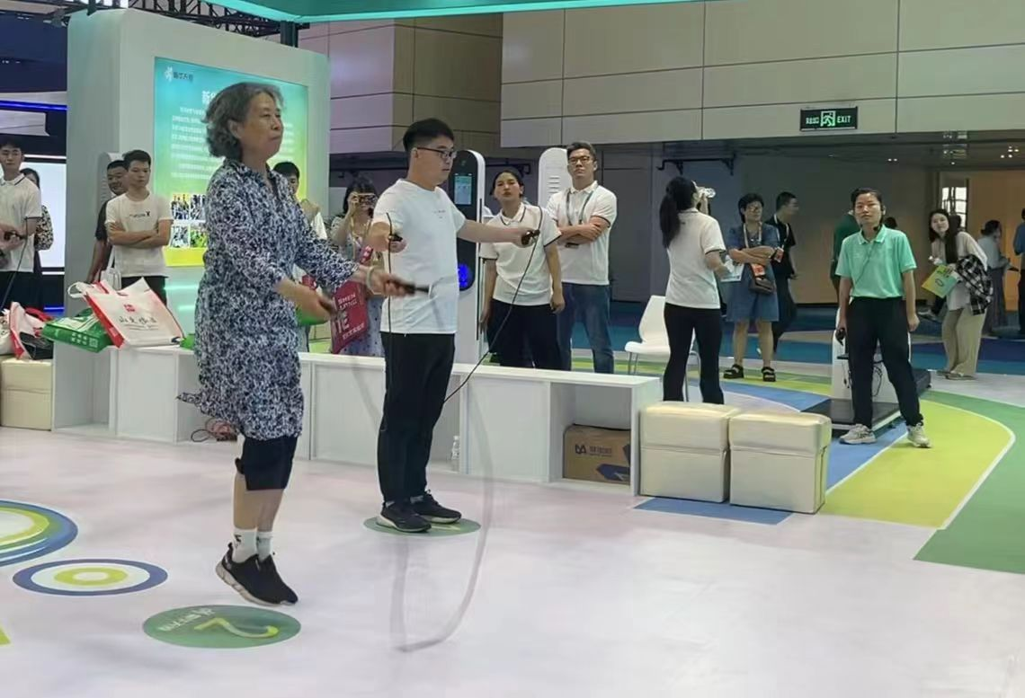 在H2-D001展位,一陣陣掌聲和喝彩聲吸引了記者的注意,原來是“新華天恒”AI智慧體育國有品牌參展商在組織智慧跳繩比賽,參賽者中甚至有一位頭發花白的老人一直嘗試單雙腳輪換跳,周圍還有不少觀眾躍躍欲試,等待體驗的機會。