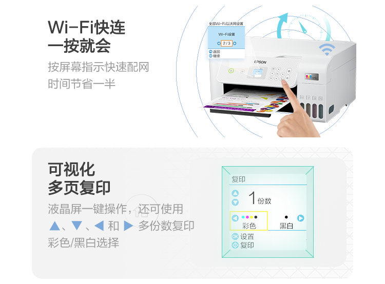L326X的Wi-Fi連接更快更簡單,用戶無需使用手機、無需下載APP,只需按照屏幕指示進行操作,步驟清晰一看便會,配網速度更快,操作更便捷,大大節省Wi-Fi連接所需時間。L326X的復印操作也更方便,用戶可以通過液晶屏一鍵操作,可視化選擇復印份數、彩色/黑白打印,甚至可以選擇放大/縮小和顏色濃度,更有身份證復印模式,滿足不同復印需求。