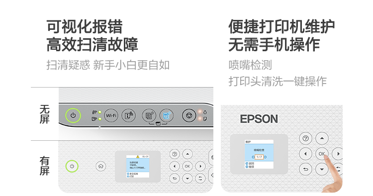 遇到打印錯誤時,L326X系列的有屏版本能夠實時彈出故障提示,并顯示故障原因和解決方法,讓新手用戶也能輕松應對。L326X提供了無需連接手機的噴嘴檢測和打印頭清洗功能,僅需五步即可讓用戶輕松完成檢查和清洗,保持打印質量。