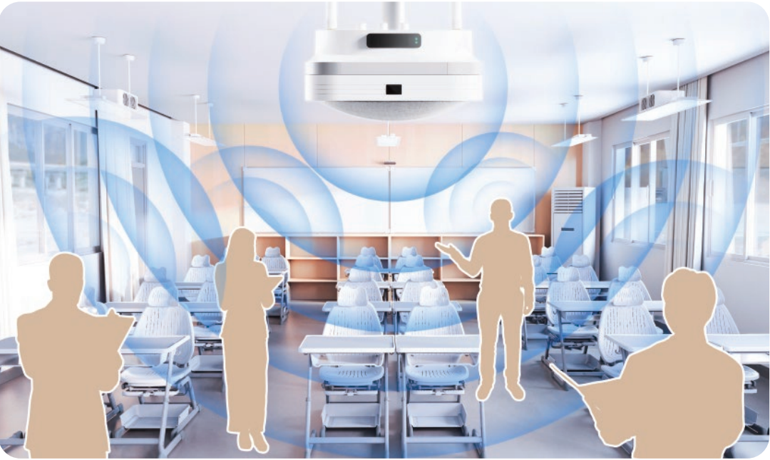 立達信健康無感擴聲系統內置AI音頻算法,精準拾取授課聲音,通過多點布局揚聲器,實現前后排聲音的聲壓級差≤2dB,讓前排不刺耳,后排也能聽得見、聽得清,保護老師嗓音,提高學生上課專注力。