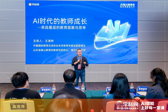 正高級研究員、國家級教學成果獎一等獎獲得者、山東省泰山教育創新研究院院長王清林以《AI時代的教師成長》為主題,進行了現場分享。王清林表示,教育的本質是教人學會思考,在人工智能背景下,陳舊的教學方式與學生真實需求之間的矛盾將會加劇,學生思辨力的提升對教學提出了更高要求。教師正成為這場教育變革的最大推動者,AI時代教師可以培養六大素養,包括人機協作力、數據洞察力、情感計算力、創新設計力、倫理判斷力以及終生進化力。人工智能工具的普及使得教育資源均衡化發展,普通學校迎來發展機遇,任何一所學校都可以憑借特色課程脫穎而出。