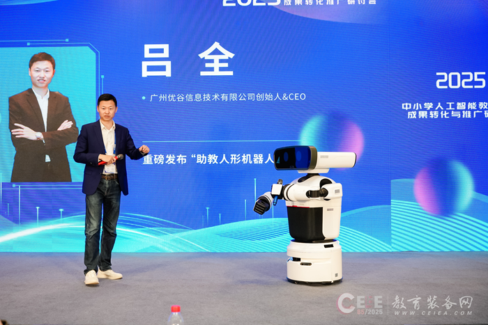 研討會期間廣州優(yōu)谷信息技術(shù)有限公司創(chuàng)始人兼CEO呂全發(fā)布了全球首款“助教人形機器人”,舉行了《小學(xué)人工智能通識課程叢書》揭幕儀式。