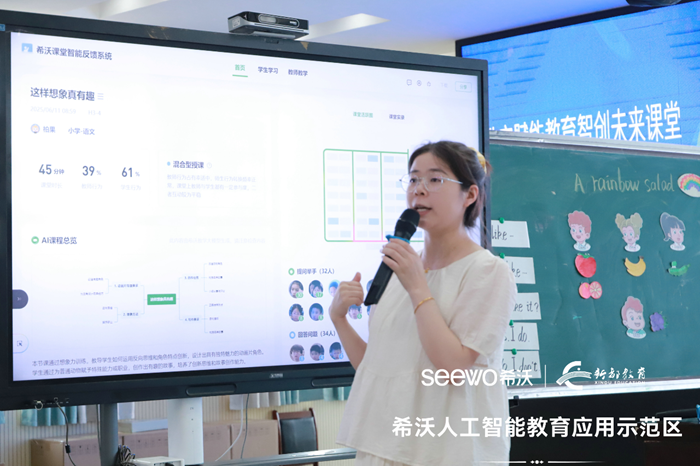 活動由兩節“人工智能+教育”應用展示課拉開帷幕,香城小學柏果老師帶了題為《這樣想象真有趣》語文課堂,柏老師巧妙運用AI技術激活學生想象力,在充滿童趣的課堂中,探索數字化工具如何為語文核心素養落地提供強大支撐。另一節題為《A Rainbow Salad》英語課堂,由廖雨瀠老師帶來,廖老師通過AI技術創設真實語言情境,實現個性化學習路徑設計,展現英語學科數字化轉型的生動實踐。