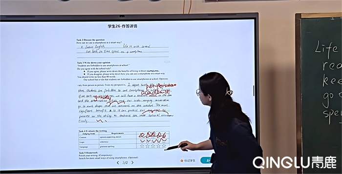英語組的廖心怡老師在《B3U3 Extended Reading》課上,引領高一學生開啟高效的“英語閱讀”之旅。課堂上,學生們通過智能筆在定制的學習單上作答,廖老師巧妙運用青鹿智慧紙筆系統,實時查看學生答題進度,隨機挑選典型答案,在大屏上進行精準、高效的講評。基于實時數據的互動方式,不僅極大提升了課堂的反饋效率,也讓教學重點更加突出。