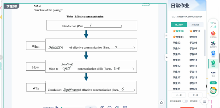 英語組張星妍老師的《XB4U2 Understanding Each Other Effective Communication》主題課也精彩紛呈。課堂上,學生們圍繞“如何實現有效溝通”的核心議題,展開小組討論。張老師借助青鹿智慧紙筆系統的分組討論功能,實時查看各小組的思維火花。對比各組的研討結論,精準把握認知差異。