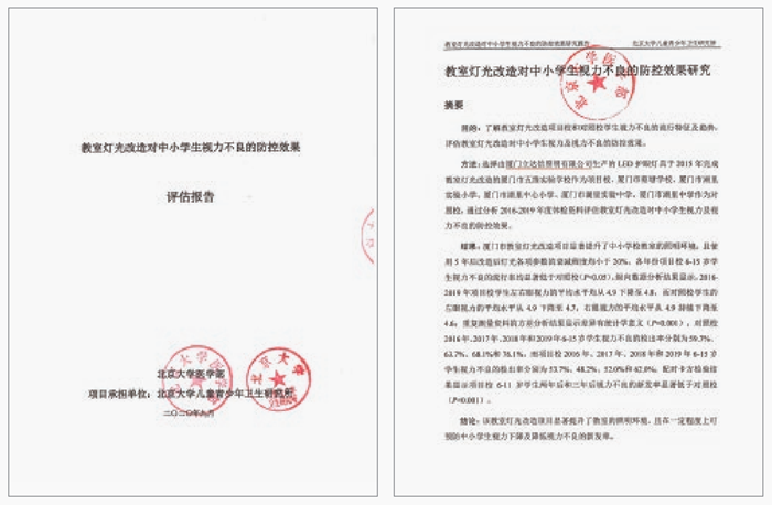 北京大學醫學部、北京大學兒童青少年衛生研究所出具的評估報告《教室燈光改造對中小學生視力不良的防控效果》顯示:立達信健康光環境改造項目顯著提升了教室的照明環境,在一定程度上可預防中小學生視力下降及降低視力不良的新發率。