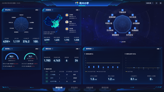 學校以希沃AI為引擎,同時通過希沃魔方·數字基座搭建四大平臺,全面整合教研管理、學生成長、教師發展、設備管理等多維度數據,打破數據孤島,實現數據互通與閉環管理。全鏈條智慧生態治理模型的建構,為管理者提供精準、高效的數據支持,使花川小學實現了教師專業發展的全流程管理。
