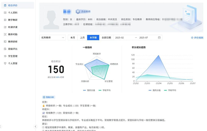 數字基座平臺無感采集教師在AI集備、聽評課以及課堂教學中的數據,并從師德修養、專業成長、教學常規和學生管理五個維度構建教師發展畫像。教師可以借助雷達圖對標成長模型,獲取個性化建議,從而為專業發展提供科學指引。教學管理者則通過電子檔案袋和多維數據分析,實現精準管理,同時為評優評職和管理策略調整提供客觀依據。