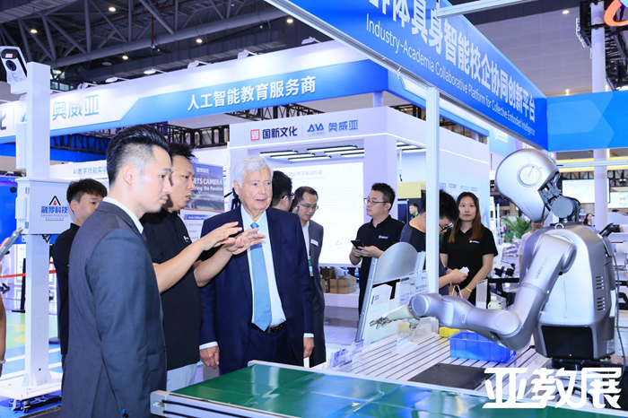 作為亞洲地區備受矚目的教育裝備博覽會,本屆亞教展首次被引入中國內地,將連續10年在中國內地舉辦。本屆亞教展順應數字技術發展趨勢,掀起教育“智變”浪潮,展區集結德國費斯托(FESTO)公司的MPS協作機器人單元和智能化Electeo電子教育設備、丹麥優傲機器人(Universal Robots)公司的協作機器人實訓站等30余家國際企業創新產品;阿里巴巴的釘釘云課堂,科大訊飛的AI黑板、人工智能通識教育平臺、虛擬人智能學習助手等中國領軍企業的智能化教學產品,真正實現“不出國門,看遍全球教育科技”。展區還吸引了宇樹科技、強腦科技、新華三、天煌科技、亞龍集團等近百家本土龍頭企業,集中展示智能機器人、腦機接口教學系統與腦科學基礎實驗系統、AI智慧課堂、國產化芯片、智慧教學終端、智慧體育裝備等創新成果,全面彰顯數字經濟蓬勃發展背景下,我國教育數字化發展的創新成果。