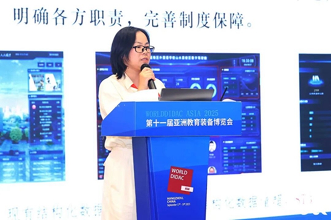甌海區(qū)教育技術(shù)中心副主任黃菊敏則從甌海區(qū)域?qū)嵺`角度,分享人工智能如何賦能區(qū)域智慧教育生態(tài)重構(gòu)。她以雙向適配為主題,從“基座與賦能”“應(yīng)用與場(chǎng)景”“治理與躍升”三個(gè)層面介紹了甌海區(qū)構(gòu)建“甌教云”智能平臺(tái)與高質(zhì)量數(shù)據(jù)體系、推進(jìn)人工智能與教育教學(xué)深度融合、打造數(shù)智驅(qū)動(dòng)的區(qū)域教育智治生態(tài)的探索,呈現(xiàn)了區(qū)域整體推進(jìn)智慧教育建設(shè)的“溫州樣本”。