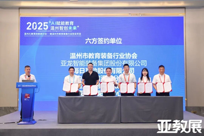 會(huì)議期間,通過(guò)“政-產(chǎn)-學(xué)-研-用”各方的深度對(duì)話,我們凝聚了“共創(chuàng)共贏”的廣泛共識(shí),成功促成溫州市教育裝備行業(yè)協(xié)會(huì)、亞龍智能裝備集團(tuán)股份有限公司、中國(guó)電信股份有限公司溫州分公司、每日互動(dòng)股份有限公司、溫州市第八高級(jí)中學(xué)及平陽(yáng)縣昆陽(yáng)第二小學(xué)共同簽署六方《2025溫州AI教育創(chuàng)新戰(zhàn)略合作協(xié)議》。
