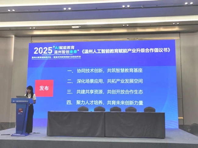 張瑜副會(huì)長(zhǎng)代表協(xié)會(huì)正式發(fā)布《溫州人工智能教育賦能產(chǎn)業(yè)升級(jí)合作倡議書》。該倡議聚焦協(xié)同技術(shù)創(chuàng)新、深化場(chǎng)景應(yīng)用、共建共享資源和聚力人才培養(yǎng)四大方向,為構(gòu)建協(xié)同創(chuàng)新的AI教育新生態(tài)奠定了堅(jiān)實(shí)基礎(chǔ)。