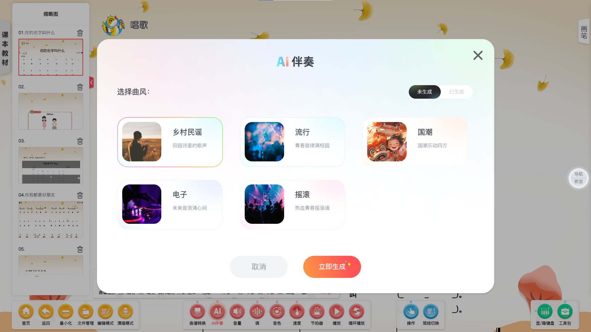 ② AI伴奏:AI伴奏以技術手段實現音樂教育與人工智能的深度融合,為教師構建了“AI+音樂教育”教學創新的實踐平臺,用智能技術輔助教學、激發潛能。無論民謠、流行、搖滾還是國潮,多種音樂風格可任選,更支持同時生成多種風格伴奏,方便對比篩選。