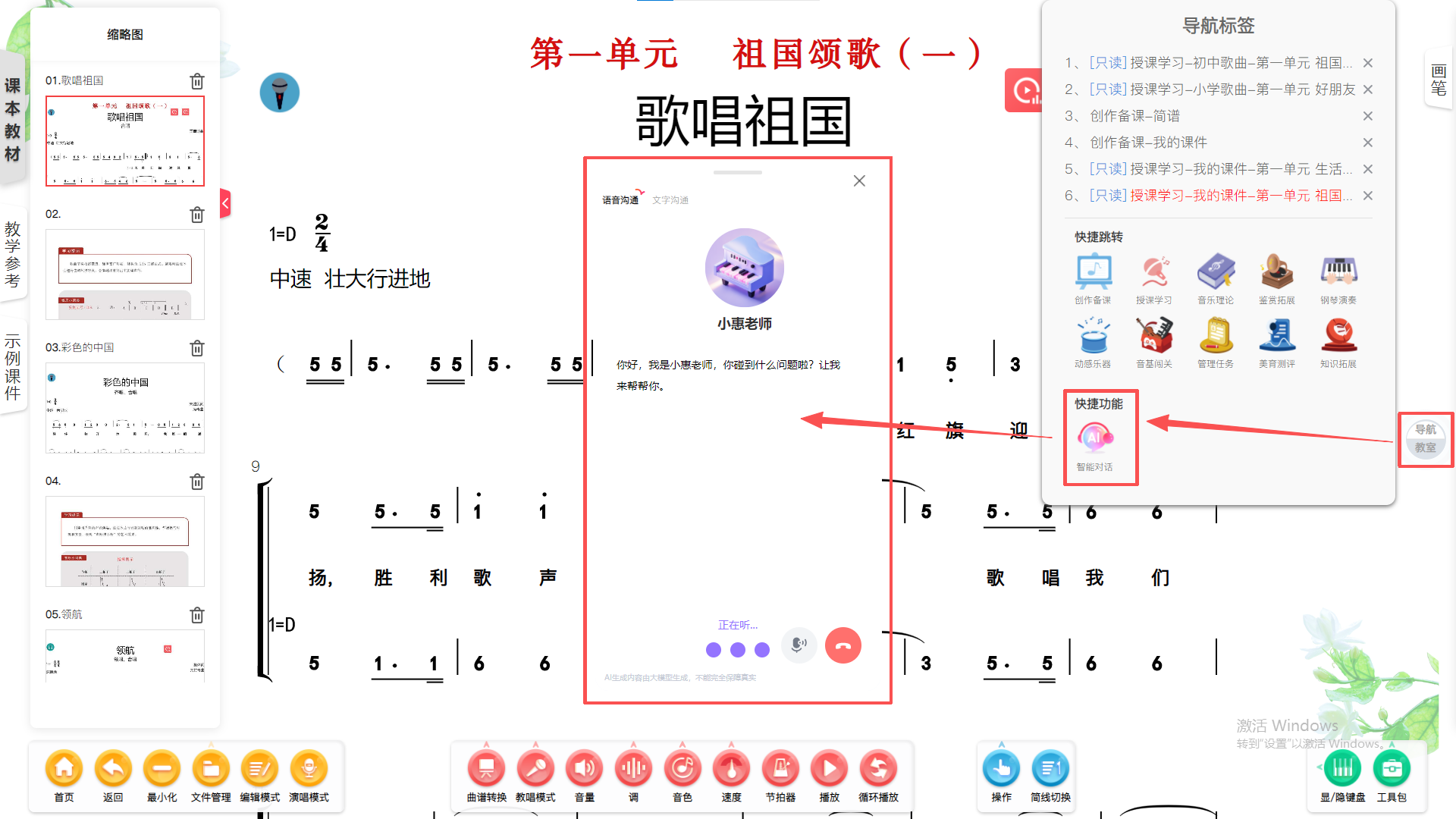 ④ AI教唱:AI教唱能夠自動生成高質量的教唱音頻,減少了教師頻繁示范的需要,有效緩解嗓子負擔。同時,可以更換任意AI演唱的音色,打開曲譜中的旋律線、手勢圖,使音樂課更有趣味性。