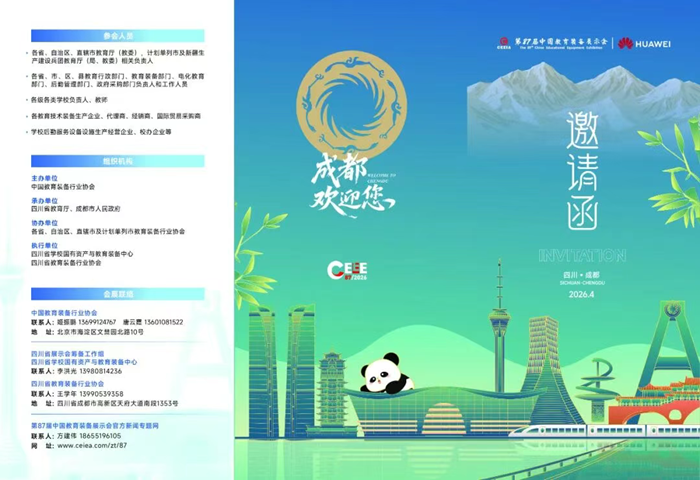 由中國教育裝備行業協會主辦的“第87屆中國教育裝備展示會”,將于2026年4月在四川成都中國西部國際博覽城隆重舉行。在此,我們向全國各地教育界的同仁、教育裝備生產經營企業的朋友們,以及所有關心教育事業的各界人士,發出最誠摯的邀請!