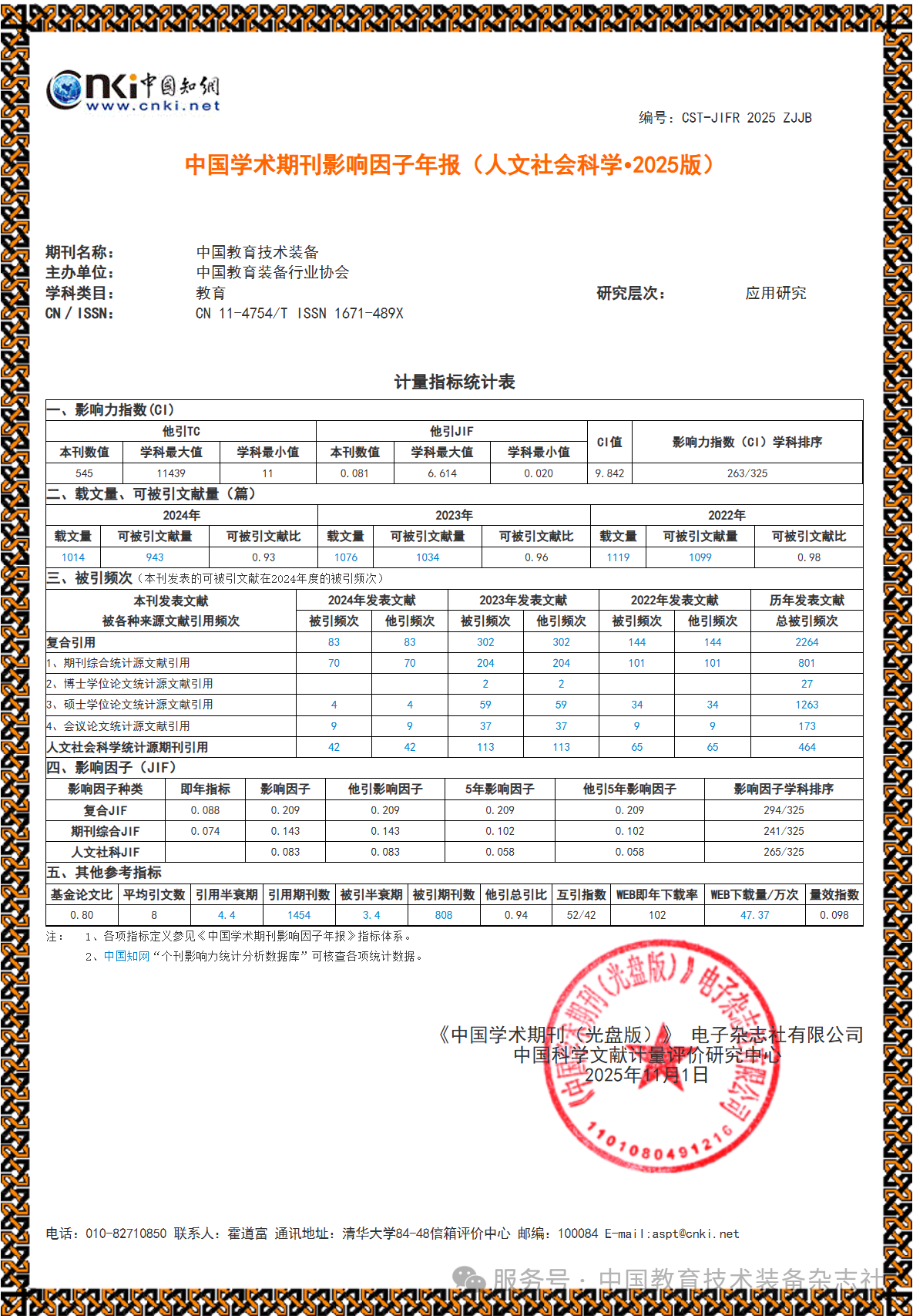 2025年11月,《中國教育技術裝備》再次入選中國知網發布的《中國學術期刊影響因子年報》(人文社會科學・2025版)。在該年報收錄的教育學科領域325種期刊中,《中國教育技術裝備》的行業影響力大幅提升:其中復合類影響因子從0.089躍升至0.209,增長11.24倍,增長率高達134.83%;而期刊影響力綜合評價指標——影響力指數(CI)亦由1.778提升至9.842,增長5.54倍,增幅達 453.54%。該數據顯示兩項核心指標呈倍數級增長。