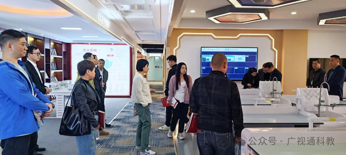 在公司董事長陳登貴的陪同下,來訪領導一行參觀了廣視通創新教育裝備體驗中心的各個展廳,包括智慧書法教室、實驗教學與操作考評系統、創新理化生實驗室、人工智能科創實驗室、數字地理教室等,詳細了解廣視通的發展歷程、企業文化、品牌建設及發展戰略等,并對廣視通的發展給予了充分肯定,期待未來雙方能有更深入的交流與合作。