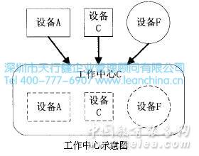 ③ 在虛擬成組生產單元中,引入工作中心的概念,如下圖所示。適當地在虛擬成組生產單元中整合或分解生產工序并匹配相應設備,組織出類似下圖中的工作中心。對于工序間生產時間差別較大的問題,工作中心會起到較好的解決效果;