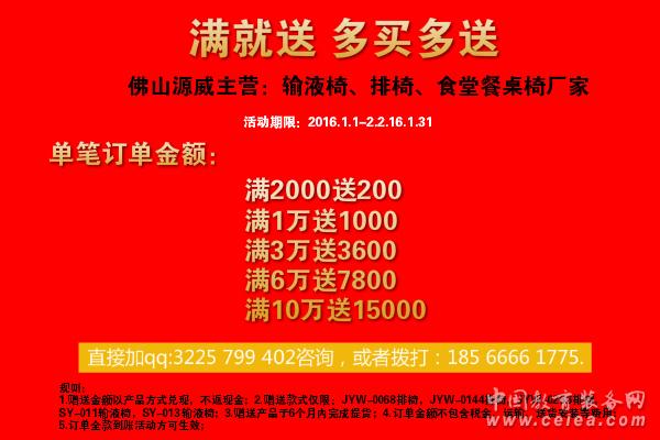 看到這條貼的時候,請您不要驚訝!此信息是真的!是佛山源威從2003年至今為止第一次讓利活動促銷.最高讓利點達15%,心動不如行動。具體活動規則如下: 一、單筆訂單金額: 滿2000送200; 滿1萬送1000; 滿3萬送3600; 滿6萬送7800; 滿10萬送15000; 多買多送; 溫馨提示:如果您的單筆訂單金額不滿足贈送條件時,可補差額預留作下筆訂單費用。 二、規則: 1.贈送金額以產品方式兌現,不返現金; 2.贈送款式僅限:JYW-0068排椅,JYW-0144排椅,JYW-0266排椅,SY-011輸液椅,SY-013輸液椅; 3.贈送產品于6個月內完成提貨; 4.訂單金額不包含稅金,運輸,送貨安裝等費用; 5.訂單全款到賬活動方可生效; 6.活動期限:2016年1月1日至2016年1月31日。活動有期限,且行且珍惜!