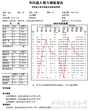 產品詳細介紹一、產品優勢: 1、系統設置:超級管理員可以管理其他管理員。所有管理員可以設置機構的信息、添加、修改測試者的信息,可以開始為測試者設置測試。 2、測驗順序限制:遵循先易后難的原則,軟件中做相應的限制,前面的分測驗沒有做完就無法做后面的測驗。 3、測試完整呈現:在測驗窗口中,呈現了測驗項目、評分參考,還能對測試者的回答進行記錄,現場評分等完整的內容。在同一個窗口,可以隨時在測驗界面和規則界面進行切換。 4、可停止測驗:當在做完某個分測驗時停止,下次同一測試者登陸的時候可以接著進行下一個分測驗。 5、自動免做:分測驗有一些題在普通情況下是免做的,在一定的條件下又要求做。這些問題完全由軟件自動完成。 6、真人讀題:在允許的情況下,可以用這一功能代替施測者讀題。 7、自動計算:可以根據評分結果自動計算IQ分類。計算時可以選擇不同的計算方式,如加權計分、二合一、四合一、六合一等等。根據選擇的不同計分方式,會產生各自的測驗報告。 8、自動計時:軟件將計時功能放在醒目的位置,給施測者以提醒。 9、項目重評:在測驗結束之后發現某個項目的評分不準確,可以對它進行重新評分。 10、傷殘評定:軟件在智力達到傷殘的標準時,會建議使用傷殘報告。軟件中還安排了《成人智殘評定量表》作為參考 11、數據管理:可以設定條件進行查詢,以數據統計中可針對某一時間段的測驗、某一年齡段的測試者、某一IQ值區間等條件進行多數據查詢。在數據查詢窗口中,可以將數據導出到excel表格中。 12、數據安全:軟件中可以進行數據筆備份和數據還原。