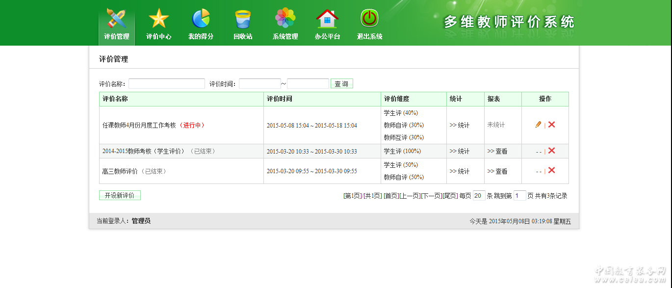 產(chǎn)品詳細(xì)介紹教師專(zhuān)業(yè)發(fā)展性評(píng)價(jià)系統(tǒng)是一套為提高教師的教學(xué)質(zhì)量,反饋學(xué)生的心聲,提高學(xué)校教務(wù)管理能力的系統(tǒng)。針對(duì)各專(zhuān)業(yè)所授課程及教師的評(píng)價(jià)結(jié)果,直觀的統(tǒng)計(jì)出每位教師的綜合能力。其中包含領(lǐng)導(dǎo)評(píng)、專(zhuān)家評(píng)、教師互評(píng)、學(xué)生評(píng)、家長(zhǎng)評(píng)五維一體的評(píng)價(jià)系統(tǒng),并支持去掉最高比例與最低比例值后的最終數(shù)據(jù),真正做到公平、公正、公開(kāi)。 |