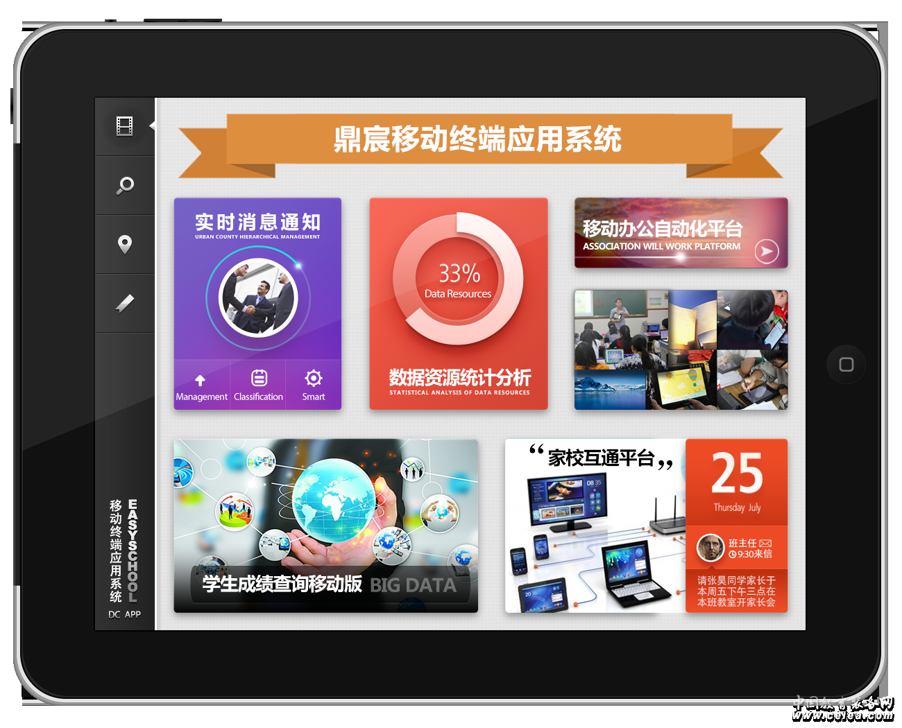 實時消息通知 作為替代短信進行通知消息發送的一種手段,消息在傳輸過程中采用數據推送的方式,該功能是采用與云平臺的Web服務對接的方式進行消息的互通互聯,同時此功能實現了對消息通知的實時接收和發送,可以查看當前采用手機登錄該系統的在線人員。 移動辦公 采用手機終端辦公,該功能采用服務端列表待辦工作校驗機制,在列表中的待辦工作存在變更的情況下才進行待辦工作的推送,待辦工作采用列表緩存方式,處理待辦工作時采用實時加載待辦詳細的方式,處理完成將待辦的詳細緩存數據進行實時清理。 家校溝通 家長通過登錄該系統與本班班主任或任課教師進行單獨溝通,班主任或任課教師采用一對多的溝通方式,如果教師不在線,消息將采用離線留言方式推送,教師登錄后采用閃爍結合聲音的方式進行消息提醒。 成績互動 班主任或任課教師將學生成績消息及近期學生成績分析結果向家長反饋,家長收到學生的成績以后根據學生成績變化情況選擇性的與班主任或任課教師進行溝通。 |