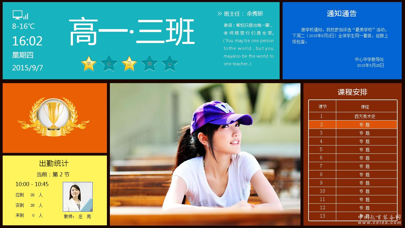 多媒體展示 21.5寸的大屏幕,最核心的區域用于進行圖片及視頻的展示播放,協助班級文化建設,無論是活動照片還是每日小知識;無論是名人故事還是學習方法,均可進行發布展示,并提供圖片庫管理功能。同時也規劃專門的區域展示班級信息、榮譽墻、班主任寄語。