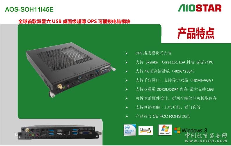 1概述編輯 Aiostar OPS 全稱為:Aiostar Open Pluggable Specification,開放式可插拔規(guī)范。是Intel與顯示器廠商共同制定的標(biāo)準(zhǔn)化數(shù)字標(biāo)牌接口規(guī)范。OPS內(nèi)部組成是一個(gè)X86架構(gòu)的迷你PC,采用英特爾酷睿處理器,配有內(nèi)存、硬盤、多種輸入輸出接口以及Windows操作界面,尺寸為200mm x 119mm x 30mm 。 以下為Intel 官網(wǎng)對(duì)于OPS的定義: 原文如下: Digital Signage Open Pluggable Specification :Simplify digital signage development Highlights Enables easier installation, use and maintenance of digital signs. Makes digital signage devices more intelligent and connected. Overview The open pluggable specification (OPS) helps standardize the design and development of digital signage devices and pluggable media players. Intel created OPS to address digital signage market fragmentation and simplify device installation, usage, maintenance and upgrades. OPS enables digital signage manufacturers to deploy interchangeable systems faster and in higher volumes, while lowering costs for development and implementation. Installing digital signage equipment based on Intel architecture helps you implement scalable digital signage applications that can network easily with other equipment. This simplifies interoperability and application upgrades designed to meet the digital signage requirements of individual customers, while helping to future-proof technology investments.[1] 譯文: 強(qiáng)調(diào) 更便于安裝、使用和維護(hù)的數(shù)字信號(hào)。 使數(shù)字看板設(shè)備更智能和融合。 概述 開放的可插拔的規(guī)范(OPS)有助于規(guī)范的設(shè)計(jì)和開發(fā)數(shù)字看板設(shè)備,并插入媒體播放器終端。Intel創(chuàng)造OPS 致力于數(shù)字看板市場分化和簡化設(shè)備安裝、使用、維護(hù)和升級(jí)。 OPS可以使數(shù)字看板制造商更快部署大量的交互系統(tǒng),同時(shí)降低開發(fā)和實(shí)現(xiàn)的成本。 安裝基于英特爾架構(gòu)的數(shù)字標(biāo)牌設(shè)備可以幫助您實(shí)現(xiàn)可伸縮的數(shù)字看板應(yīng)用程序,并且很容易和其他設(shè)備進(jìn)行網(wǎng)絡(luò)連接。這簡化了通過交互和升級(jí)的設(shè)計(jì)來滿足個(gè)人客戶的數(shù)字看板需求,同時(shí)有利于面向未來的技術(shù)投資。 2特點(diǎn)編輯 1、支持?jǐn)?shù)字標(biāo)牌等行業(yè)最新的OPS規(guī)范的電腦模塊,加速數(shù)字標(biāo)牌行業(yè)的標(biāo)準(zhǔn)化趨勢。 2、OPS模塊可以簡化設(shè)備的安裝、使用、維護(hù)和更新,幫助數(shù)字標(biāo)牌制造商降低開發(fā)和實(shí)施成本。 3、OPS可簡便地與其它設(shè)備聯(lián)網(wǎng),可擴(kuò)展數(shù)字標(biāo)牌應(yīng)用,滿足數(shù)字標(biāo)牌對(duì)交互和應(yīng)用更新的需求。 4、部分OPS平臺(tái)支持遠(yuǎn)程管理及低功耗模式,解決耗電及散熱要求。同時(shí)平臺(tái)所支持的Intel vPro、AMT遠(yuǎn)程管理技術(shù),實(shí)現(xiàn)設(shè)備無人操控下的高效運(yùn)作。如采用四代i5+Q87平臺(tái)的AOS-SOQ8I45A 5、OPS無風(fēng)扇散熱設(shè)計(jì),提供超靜音的解決方案,保證工作環(huán)境的安靜、清爽。發(fā)熱量小也帶來了較小的功耗。 3整機(jī)編輯 Intel 2011年提出該規(guī)范后,伴隨著日本NEC OPS接口顯示器的上市,傳統(tǒng)數(shù)字標(biāo)牌嵌入式主板走下神壇,OPS模塊化正式開啟。代表作品有 愛鑫微電子(AIOSTAR) AOS-SOH8I45A ,