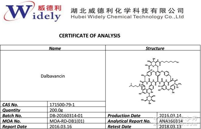 產品詳細介紹鹽酸達巴萬星威德利品牌科研高純試劑
